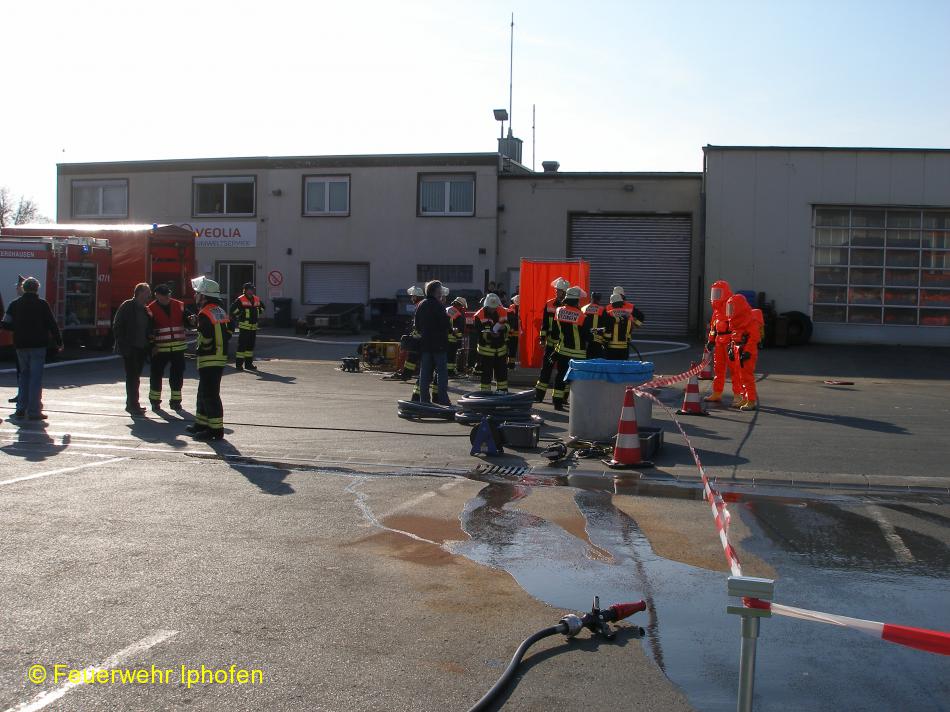 Einsatzbericht: Dieses Jahr fand die Abschlussübung des 1. Löschzugs Gefahrgut auf dem Gelände der Fa. Veolia in Kitzingen statt. Angenommen wurde das Auslaufen eines Lösungsmittel aus einem defekten Stutzen. Die Feuerwehr Iphofen übernahm den Brandschutz mit Schaum und Pulver, während die Feuerwehr Kitzingen die auslaufende Flüssigkeit auffing und die undichte Stelle verschloss. Anschließend wurden die "kontaminierten" Einsatzkräfte von der Feuerwehr Sickershausen dekontaminiert.