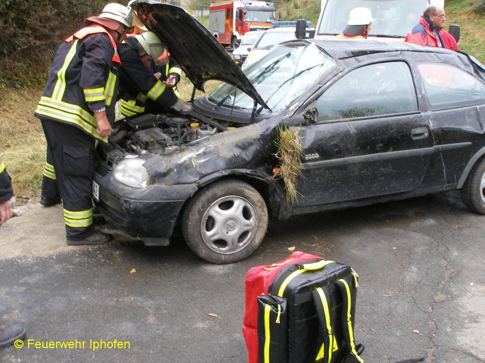 Einsatzbericht: Entgegen der Einsatzmeldung konnte die Person ohne technische Hilfsmittel befreit und dem Rettungsdienst übergeben werden. Die FF Iphofen musste deshalb nur auslaufenden Betriebsstoffe binden.
